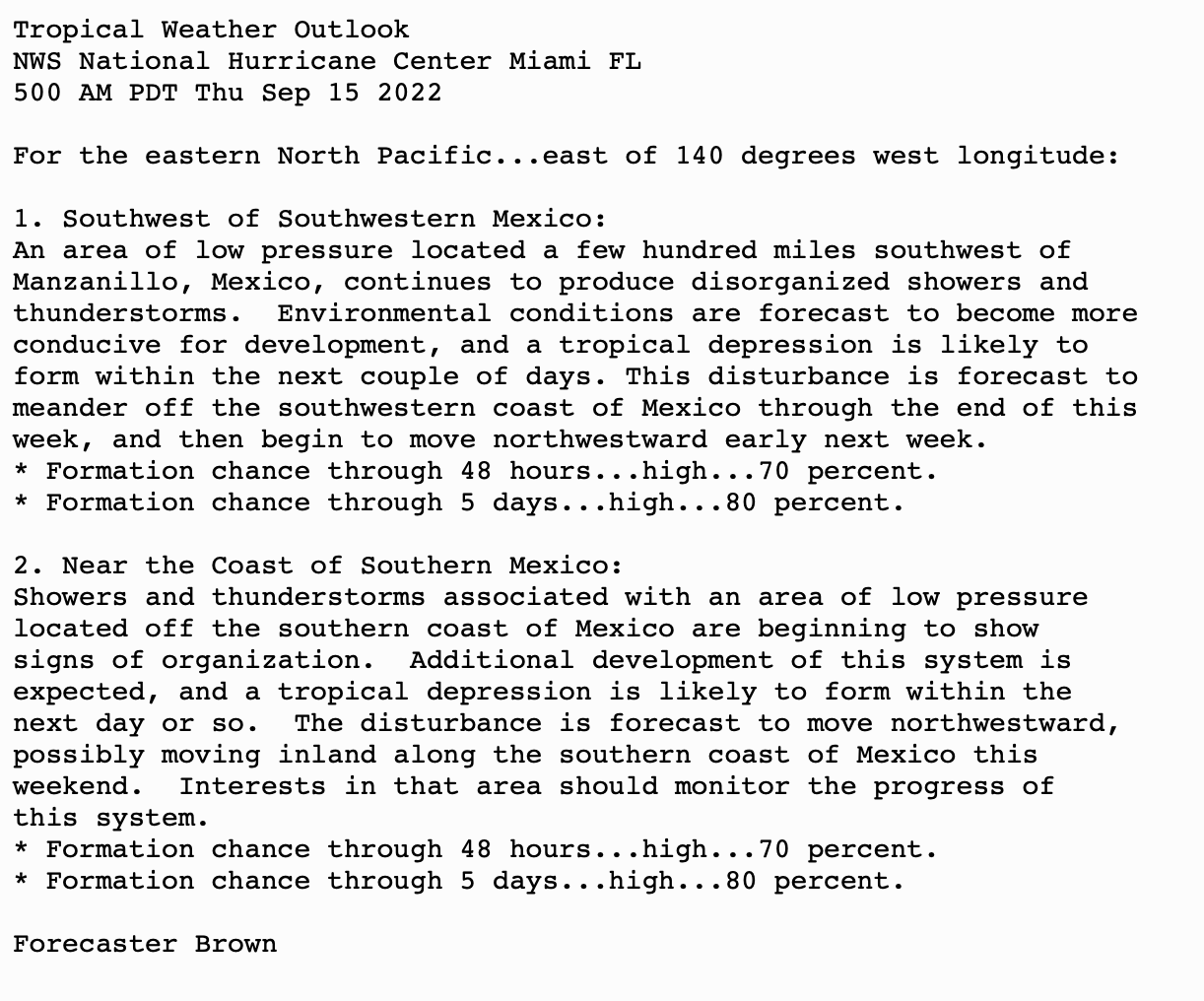 | Tropical Weather Outlook 500 AM PDT Fri Sep 16 2022 Tropical Weather Discussion 1005 UTC Fri Sep 16 2022 | |