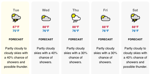 Temperature: Today’s expected temperatures – 71°F to 87°F. Yesterday: H 87.5°F L 71.2°F