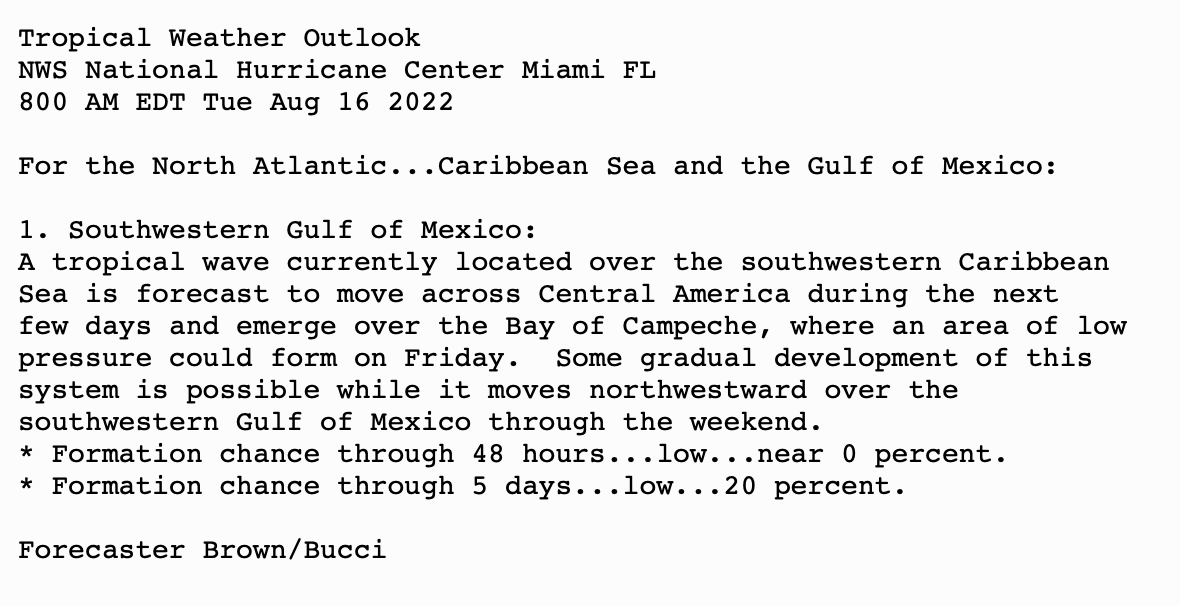 | Tropical Weather Outlook (en Español*) 800 AM EDT Tue Aug 16 2022 1205 UTC Tue Aug 16 2022 | |