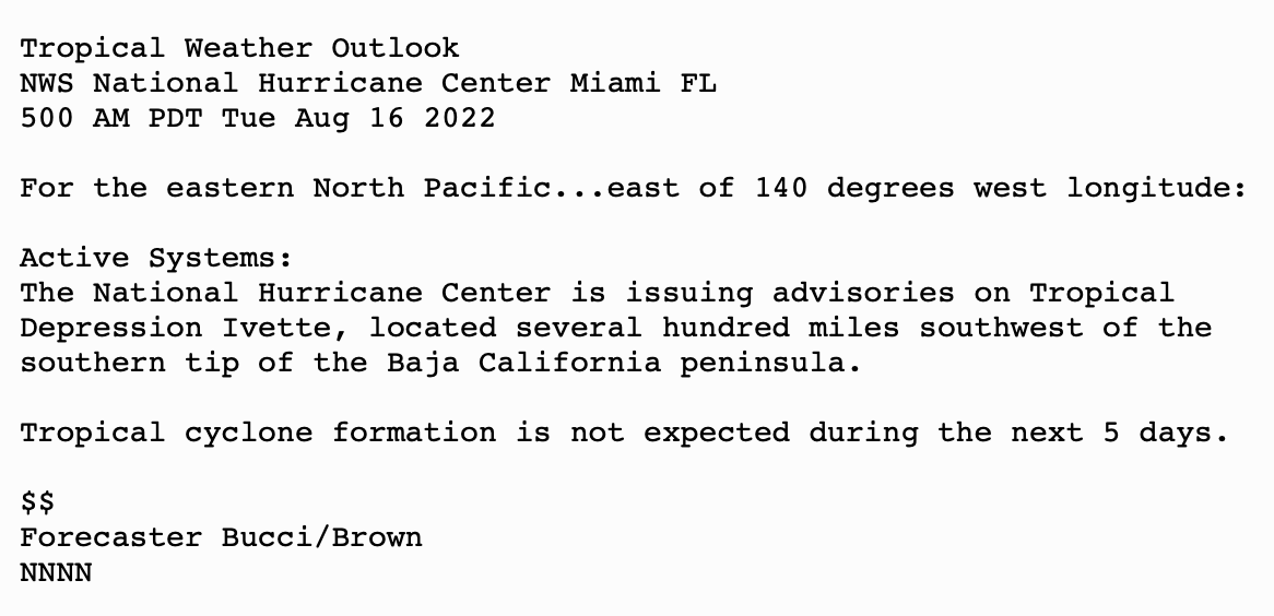 | Tropical Weather Outlook 500 AM PDT Tue Aug 16 2022 Tropical Weather Discussion 1005 UTC Tue Aug 16 2022 | |