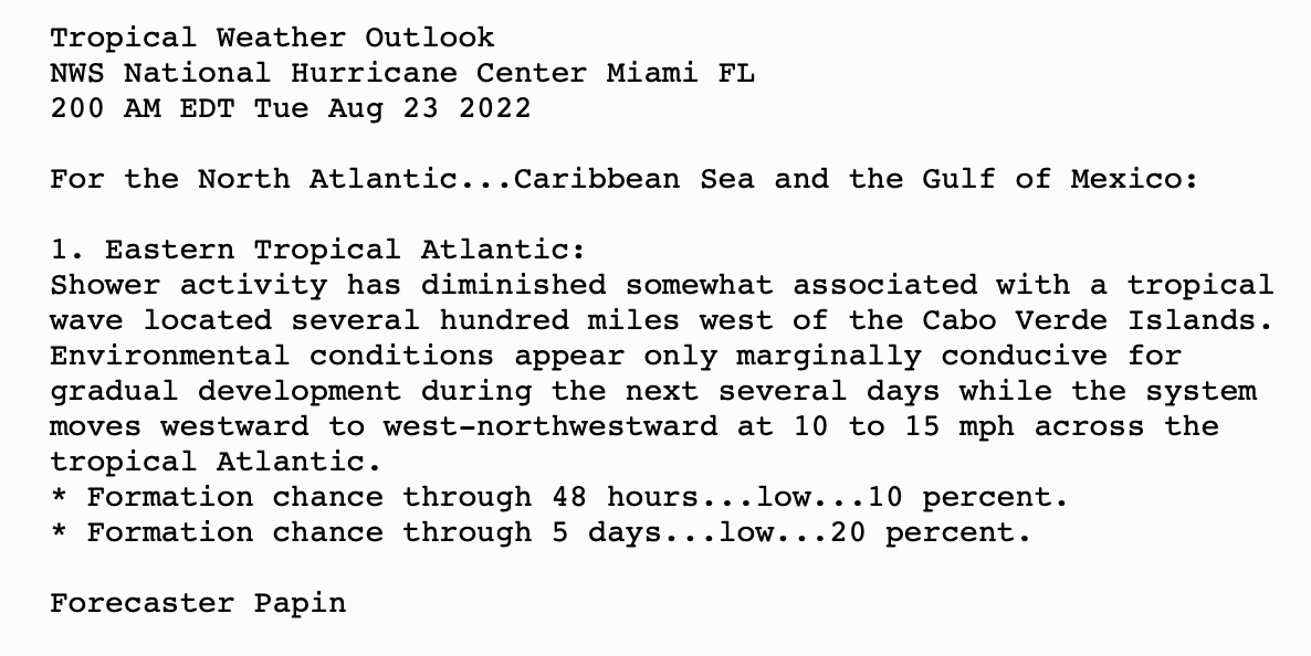 | Tropical Weather Outlook (en Español*) 800 AM EDT Tue Aug 23 2022 1205 UTC Tue Aug 232 2022 | |