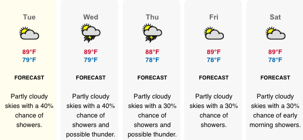 Temperature: Today’s expected temperatures – 83° to 89°F. Yesterday: H 85.5°F L 75.4F