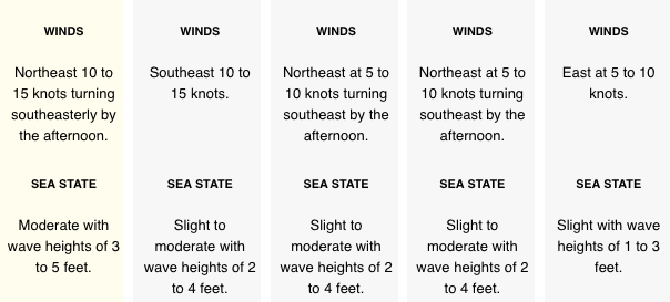 Winds: Today E 10-20 mph Tonight ESE 10-15 mph