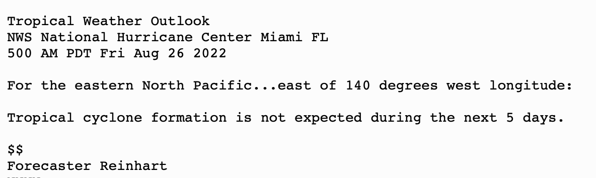 | Tropical Weather Outlook 500 AM PDT Fri Aug 26 2022 Tropical Weather Discussion 1005 UTC Fri Aug 26 2022 | |