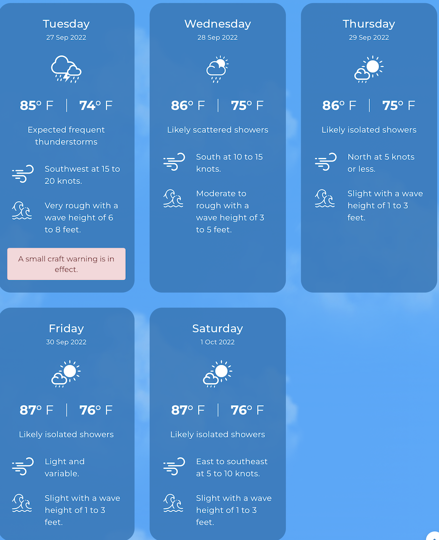 Day: Tropical storm conditions. Windy with showers in the morning. Thunderstorms developing for the afternoon. Night: Windy with scattered thunderstorms.