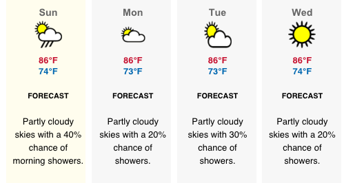 Temperature: Today’s expected temperatures – 76°F to 86°F. Yesterday: H 86.4°F L 74.6°F