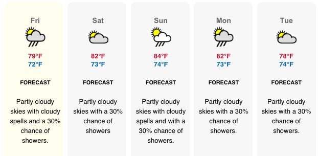 Temperature: Today’s expected temperatures – 76°F to 85°F. Yesterday: H 84.3°F L 72.6°F