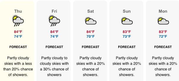 Temperature: Today’s expected temperatures – 80°F to 88°F. Yesterday: H 88.1°F L 75.5°F