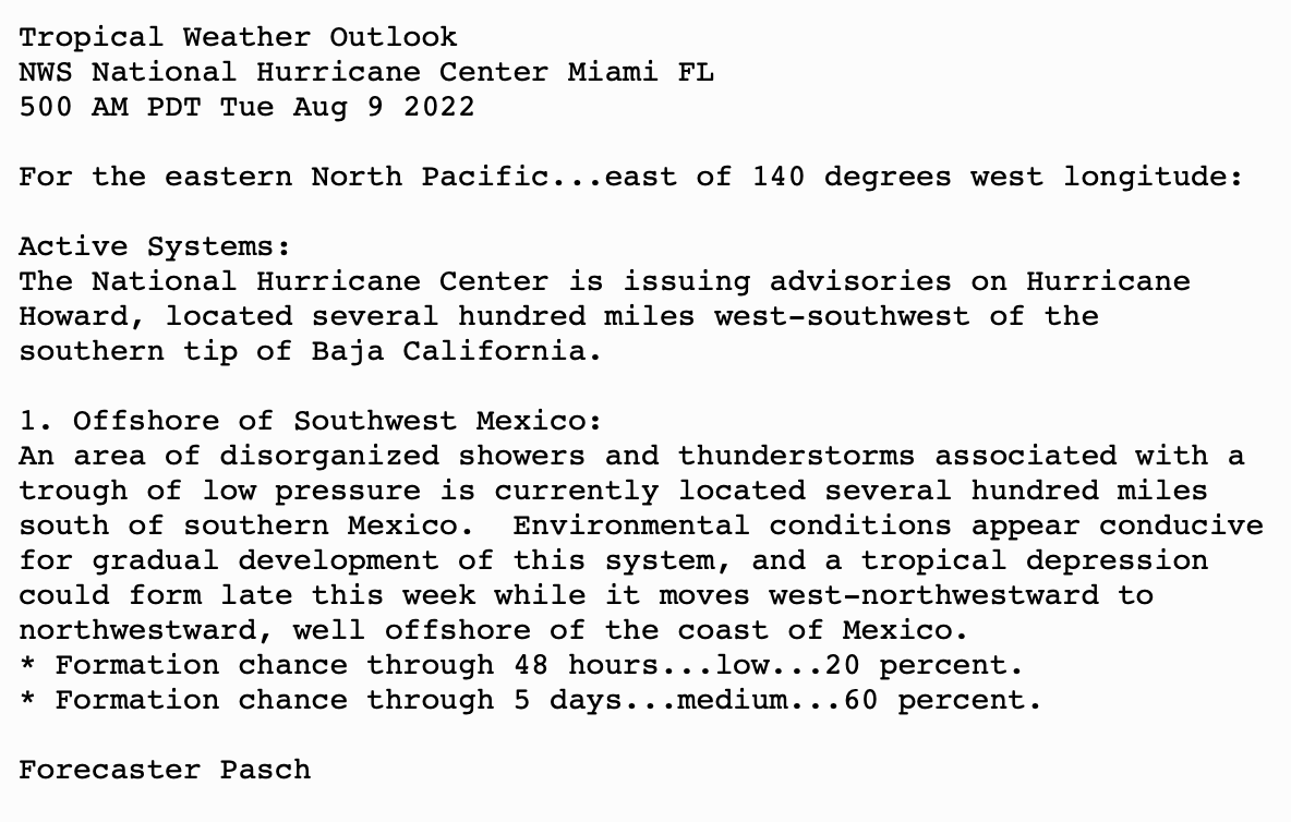 | Tropical Weather Outlook 500 AM PDT Tue Aug 9 2022 Tropical Weather Discussion 1005 UTC Tue Aug 9 2022 | |