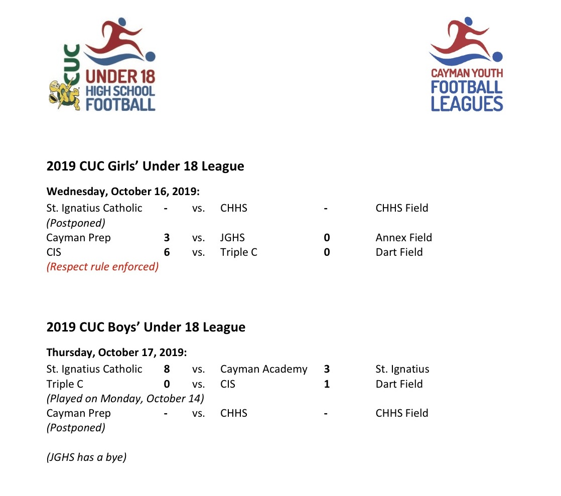 Cayman: 2019 CYFL High School Football League : Weekly Scores