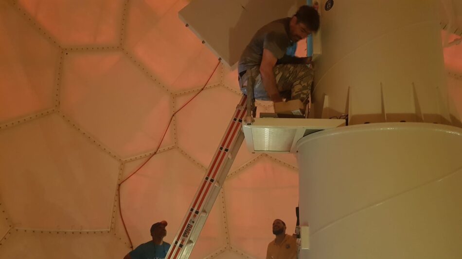 Technical team working at the radar pedestal Cesar Mello, LEONARDO Radar Engineer, carefully performs repairs inside the Kearney Gomez Doppler radar dome.