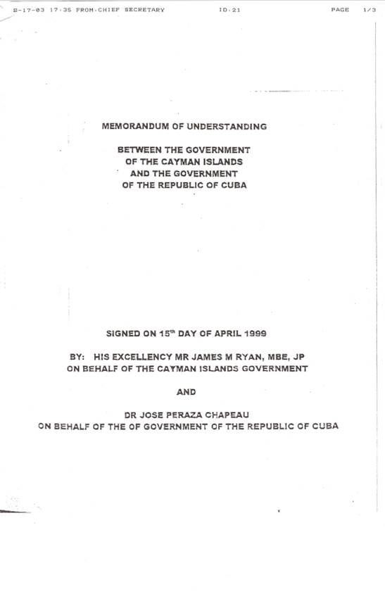 The declaration by the United Kingdom appointed Governor led to urgent negotiations with the government of Cuba culminating in agreement to a short three page memorandum of understanding signed by then Chief Secretary of the Cayman Islands James Ryan and Ambassador Dr. Jose Peraza Chapeau on 15 April 1999.