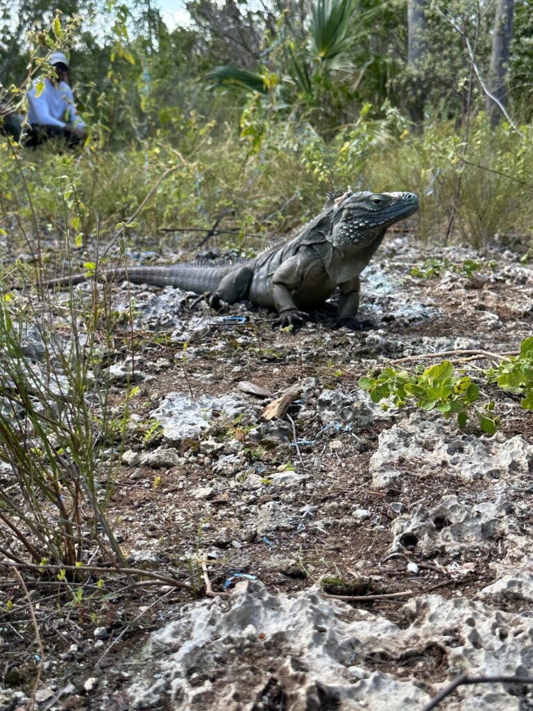 The National Trust for the Cayman Islands currently protects just over 3,500 acres of critical habitat. Colliers Wilderness Reserve is one of the primary habitats where our Blue Iguanas are released into the wild. This protected area is of ecological importance and is over 190 acres. An abundance of local flora and fauna can be found in Colliers Wilderness Reserve as this protected area maintains the biodiversity that lives there. After the helicopter dropped off the troops and BIC team members, they were welcomed by a wild, Blue Iguana that had been released into Colliers Wilderness Reserve approximately 5 years ago. The Blue Iguana stayed with the team as they conducted their work and posed for a few photos.