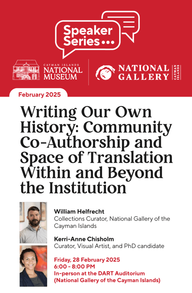 Join us for a thought-provoking lecture featuring Kerri-Anne Chisholm (Curator, Visual Artist, & PhD Candidate) and William Helfrecht (Collections Curator, National Gallery Cayman Islands). Their talk, “Writing Our Own History: Community Co-Authorship and Spaces of Translation Within and Beyond the Institution,” explores how communities shape their own narratives through art, storytelling, and shared spaces.