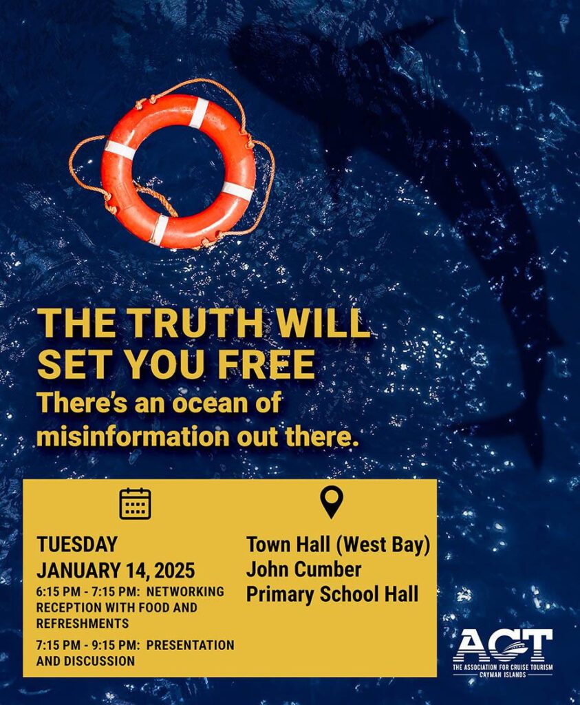 | WHO: The Association for Cruise Tourism (ACT) in the Cayman Islands Featured presentation: Ellio Solomon, Executive Program Manager, ACT, followed by Q&A WHAT: Town Hall Meeting WHEN: Tuesday, January 14, 2025 6:15 p.m. – 7:15 p.m.: Networking Reception with Food and Refreshments 7:15 p.m. – 9:15 p.m.: Presentation and Discussion WHERE: John Cumber Primary School Hall, West Bay WHY: To discuss cruise tourism in the Cayman Islands |