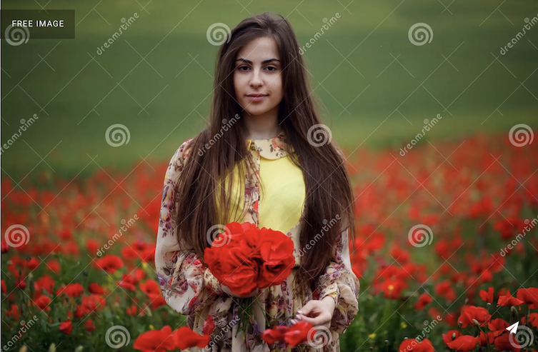 Close Up Portrait Of Hair Long Young Woman Holding In Hands A Bouquet Of Red Flowers B