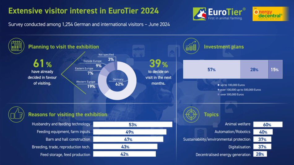 Five months before kick-off, interest in the EuroTier / EnergyDecentral 2024 trade fairs is already high among visitors. In a survey of potential professional farming visitors to the world’s leading trade fair for professional animal husbandry and livestock management, 60 percent of respondents stated that they have already made firm plans to visit EuroTier in Hanover, Germany. Some 30 percent responded that they will be making a decision in the coming weeks. The exhibition areas of housing and feeding technology as well as feed input and operating resources were particularly highly rated. When it comes to current industry topics, visitors from both Germany and abroad ranked as most interesting animal welfare, sustainability, automation, robotics and digitalization. 1,250 respondents from both Germany and abroad took part in the online survey. EuroTier, the world’s leading trade fair for professional animal husbandry and livestock management, will take place alongside EnergyDecentral, the leading international trade fair for decentralised energy supply, from 12 to 15 November 2024 in Hanover, Germany.
