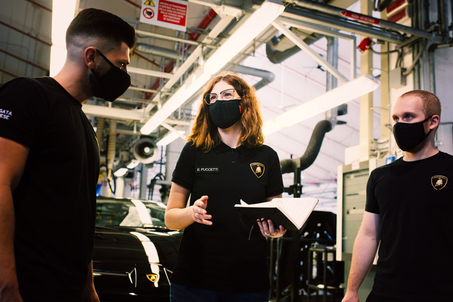 The photo shows Erika Puccetti, Aventador Assembly Line Forewoman, stated “Being a female department head in manufacturing is not easy, especially in a male-dominated team. It takes a lot more effort to be credible and have authority. There’s a tendency to think that just because you’re a woman you’re not suited to understand certain technical aspects. I’ve always liked challenges! I’m happy that a company like Lamborghini has decided to invest in women in production; in my office, for example, there are two female and two male department heads. In addition, I consider myself very lucky because, despite being the first female head of department in the Aventador line, I found a team that supports me and helps me grow personally and professionally.â€