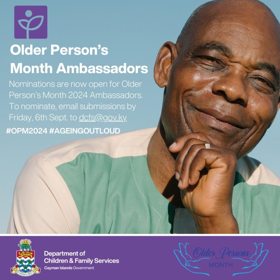 Grand Cayman, Cayman Islands. 4 September 2024 – There is still time to nominate 2024 Older Person’s Month Ambassadors. This year’s theme, “Age Out Loud,” celebrates the vibrant voices, active lifestyles, and significant contributions of our older persons throughout the month of October, encouraging them to continue making their mark in our community.