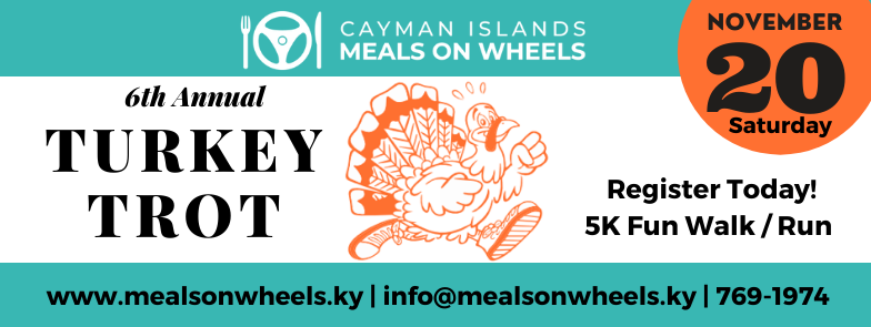 Registration is now open for the 6th Annual Meals on Wheels Turkey Trot 5k FUNdraising Walk/Run which will take place on November 20th, 2021, and 6am. Start and Finish will be at Grand Old House, South Church Street. Register today for the Meals on Wheels Turkey Trot at www.mealsonwheels.ky. Packet pick-up will take place on November 17th (12 noon to 6 pm) or November 18th (10 am to 4 pm) at Westin Resort, Galleon Ballroom ~ Seven Mile Beach, West Bay Road.