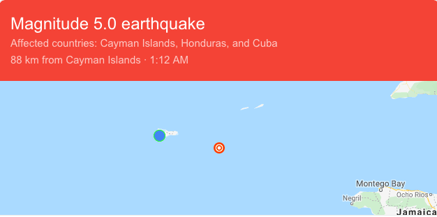 A Magnitude 5 #earthquake occurred at 1:12 am on December 9th, with the epicenter located 47 miles ESE of East End, Grand #Cayman – No reports of damage at this time. (Image from USGS)