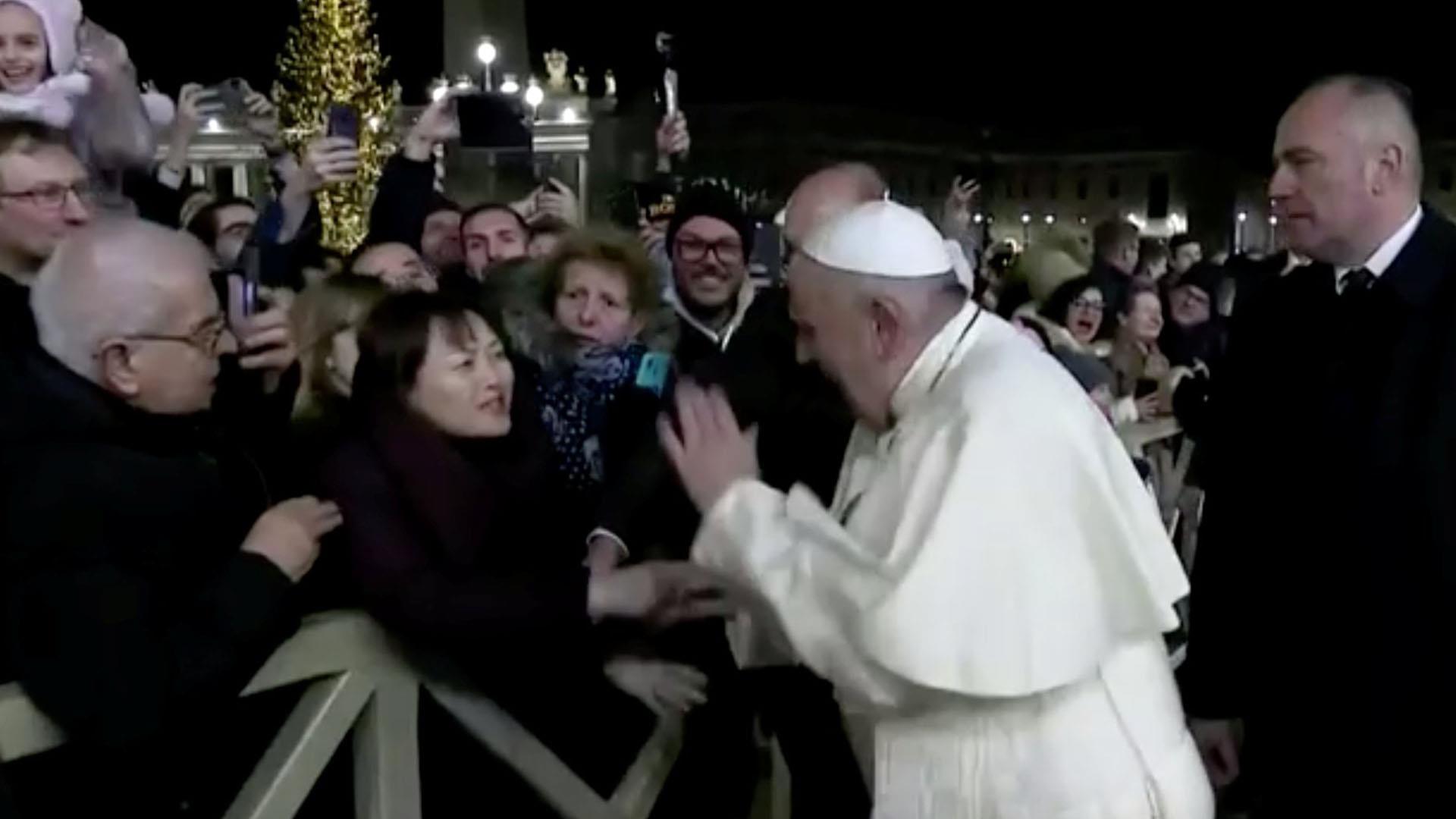 For more on this story and video go to: https://www.bbc.com/news/av/world-europe-50964548/pope-francis-slaps-pilgrim-s-hand-after-she-yanks-his-arm