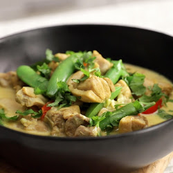 Coconut milk, fresh lime, and curry powder give this quick stew, made with boneless chicken thighs, a decidedly Caribbean flavor. Feel free to sub in other favorite vegetables for the snap peas and bell pepper strips, and add a side of rice to go with it.