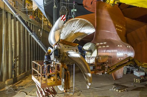 The 7,860 lb. propellers, part of the 20.5-megawatt azipods, are getting their finishing touches before being placed onboard Spectrum of the Seas.