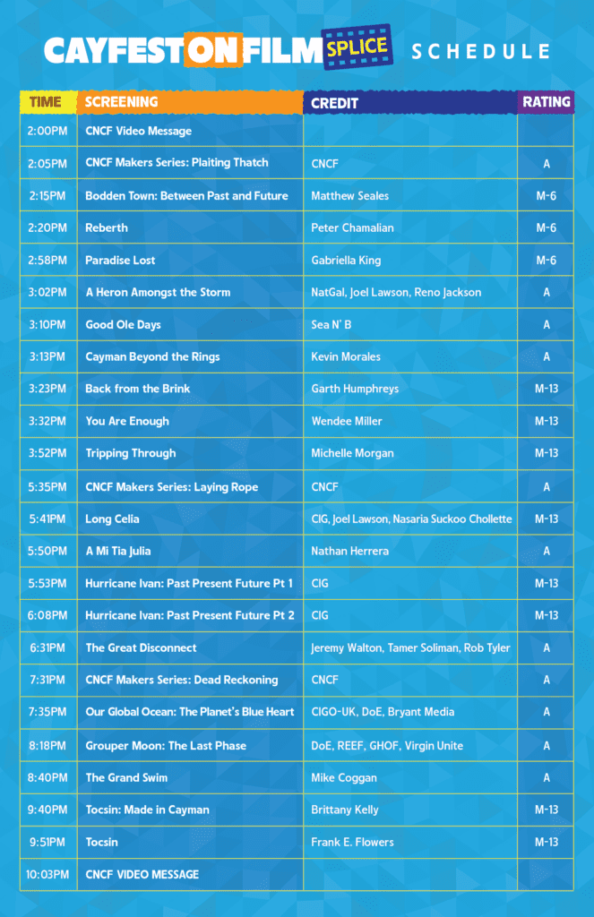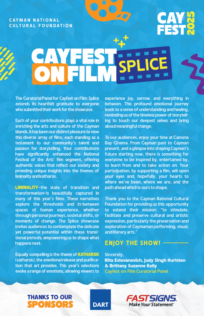 The Cayfest on Film: Splice showcase offers an unparalleled opportunity to experience the diverse range of storytelling by Caymanian filmmakers and filmmakers who have created work in and for the community. The lineup includes short films, documentaries, feature films, and music videos, covering every imaginable genre.