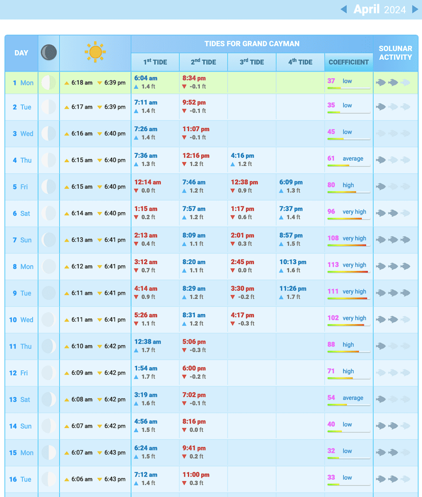 IMPORTANT NOTICEThe times reflected in the tidal table for Grand Cayman are predictions valid as references for sports fishing in areas near the coast of Grand Cayman. THEY ARE NOT SUITABLE FOR NAVIGATION. Remember that to practice any activity at sea like diving, windsurfing and fishing from a boat or underwater fishing should always be consulted with the official tide tables of the port of Grand Cayman.