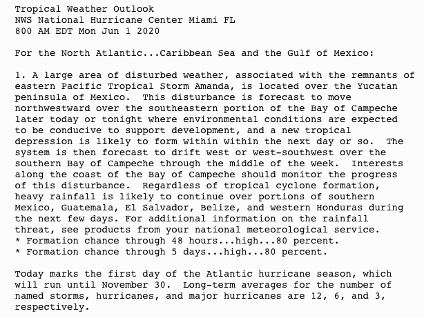 | Tropical Weather Outlook (en Español*) 800 AM EDT Mon Jun 1 2020 |