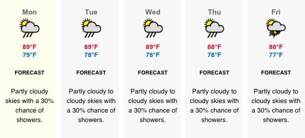 Temperature: Today’s expected temperatures – 82°F to 91°F. Yesterday: H 90.3°F L 80.9°F