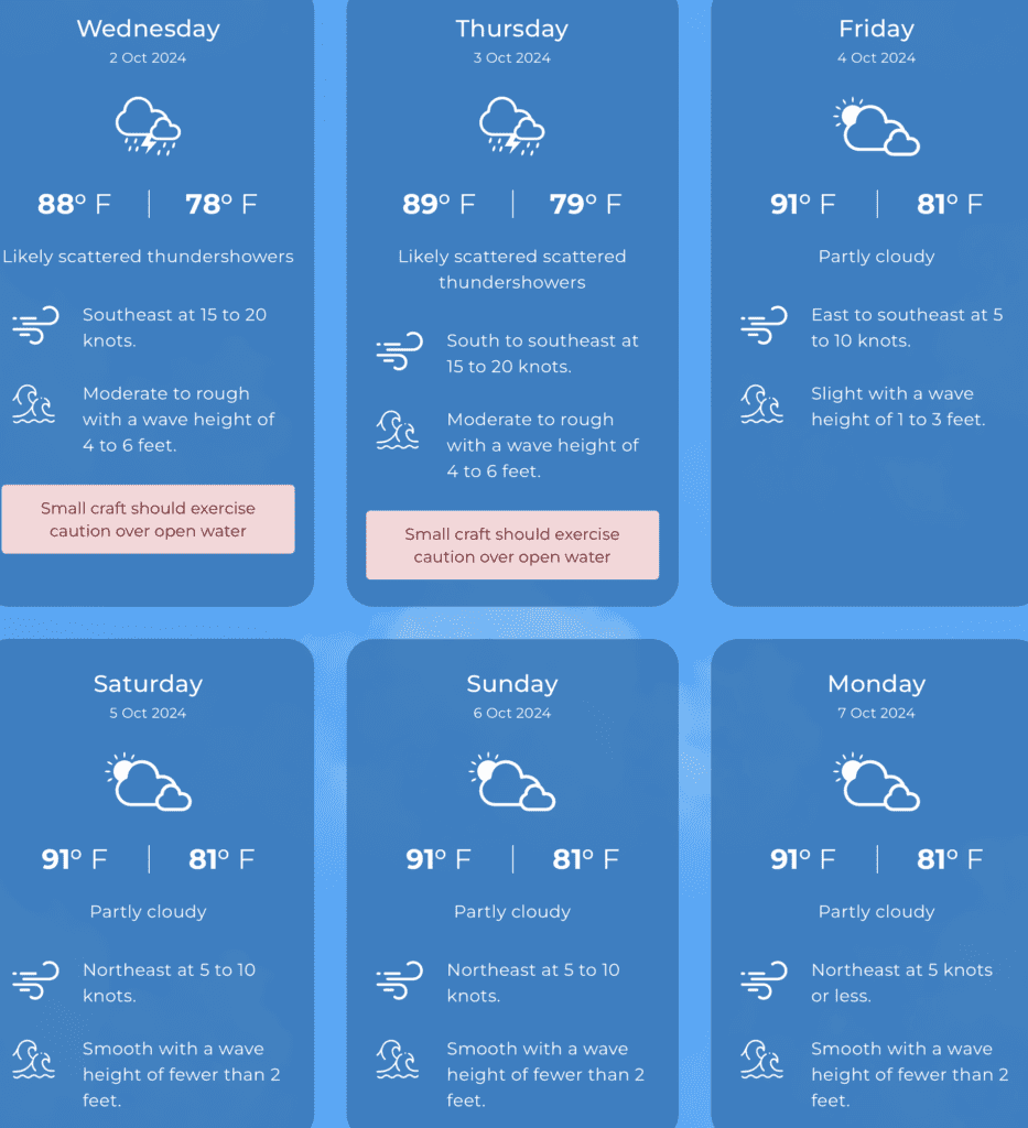 Expected temperatures: 90°F to 80°F. Yesterday: H 90.3°F L 80.2°F