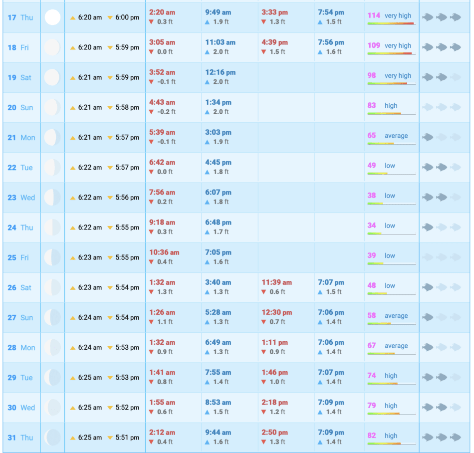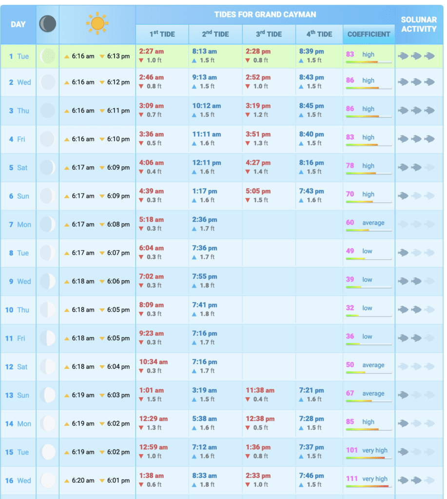 IMPORTANT NOTICEThe times reflected in the tidal table for Grand Cayman are predictions valid as references for sports fishing in areas near the coast of Grand Cayman. THEY ARE NOT SUITABLE FOR NAVIGATION. Remember that to practice any activity at sea like diving, windsurfing and fishing from a boat or underwater fishing should always be consulted with the official tide tables of the port of Grand Cayman.