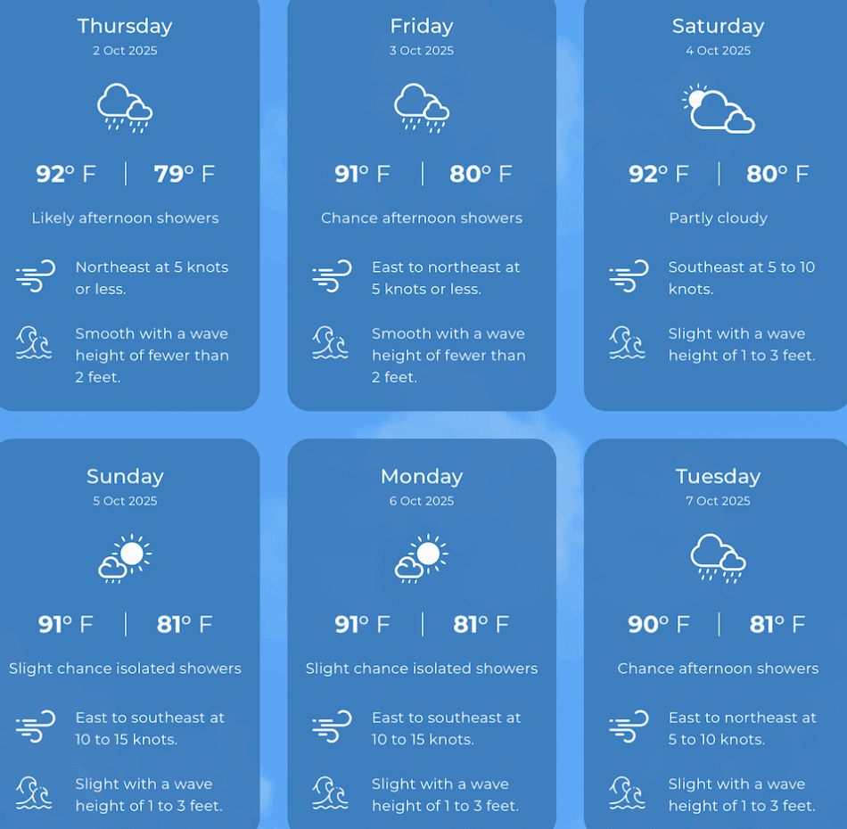 Light winds becoming variable at times will persist through the next few days as the pressure gradient across the northwest Caribbean remains slack. As a result of these light winds, some late-afternoon showers are likely on Thursday and Friday.
