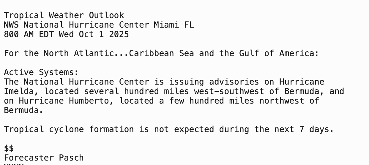 | Tropical Weather Outlook 800 AM EDT Wed 1 Oct 2025 1205 UTC Wed 1 Oct 2025 | |