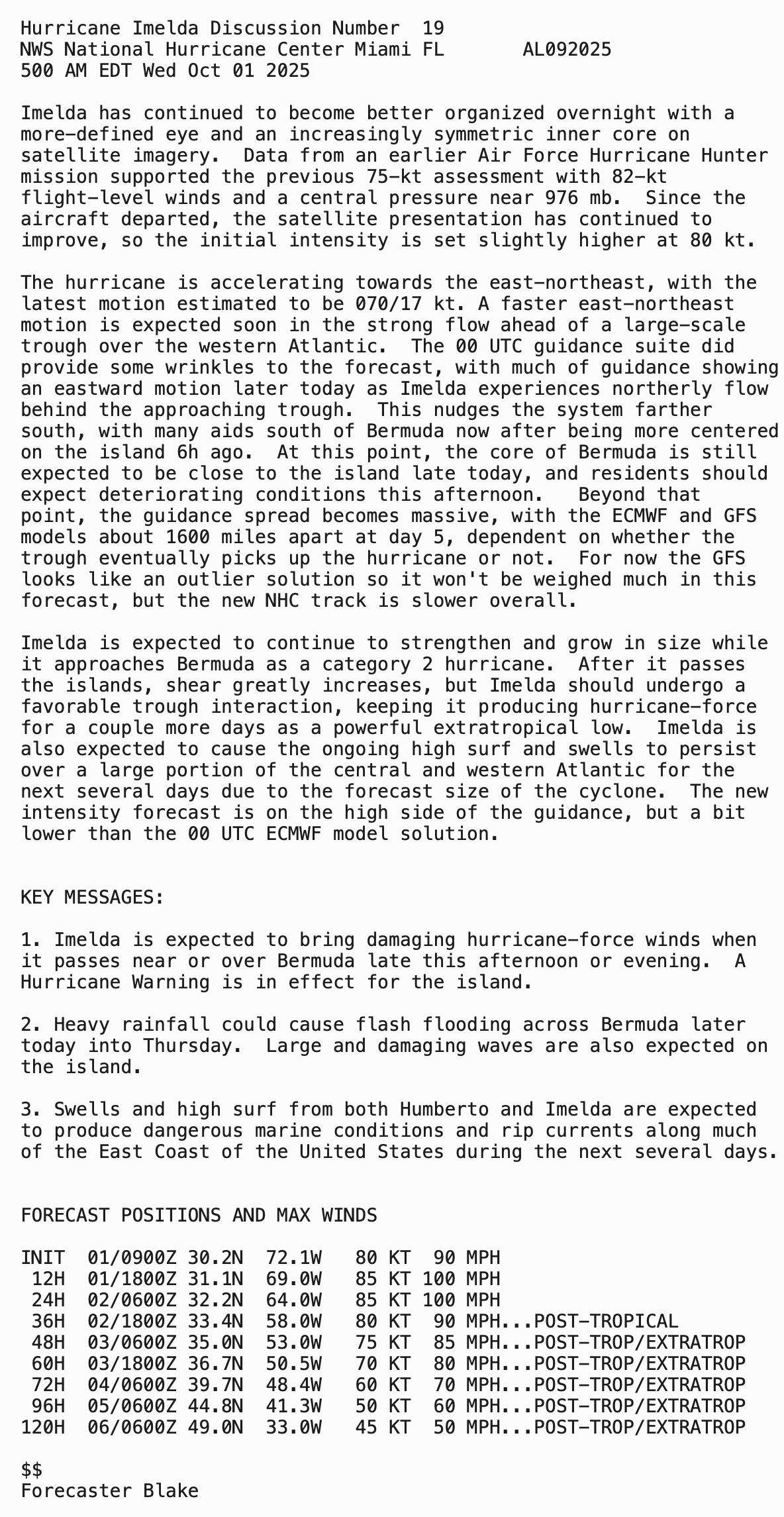 IMELDA EXPECTED TO BRING HURRICANE-FORCE WINDS, DAMAGING WAVES, AND FLASH FLOODING TO BERMUDA LATER TODAY AND TONIGHT… …AIR FORCE HURRICANE HUNTERS CURRENTLY INVESTIGATING IMELD