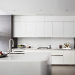 The kitchen features a marble island with edges that swoop down like the building’s facade. Hadid worked with the Italian designer Boffi to create it.