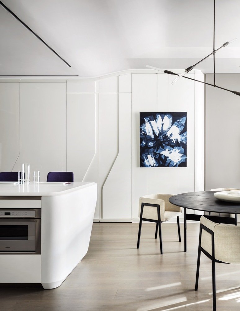 The kitchen features a marble island with edges that swoop down like the building’s facade. Hadid worked with the Italian designer Boffi to create it.