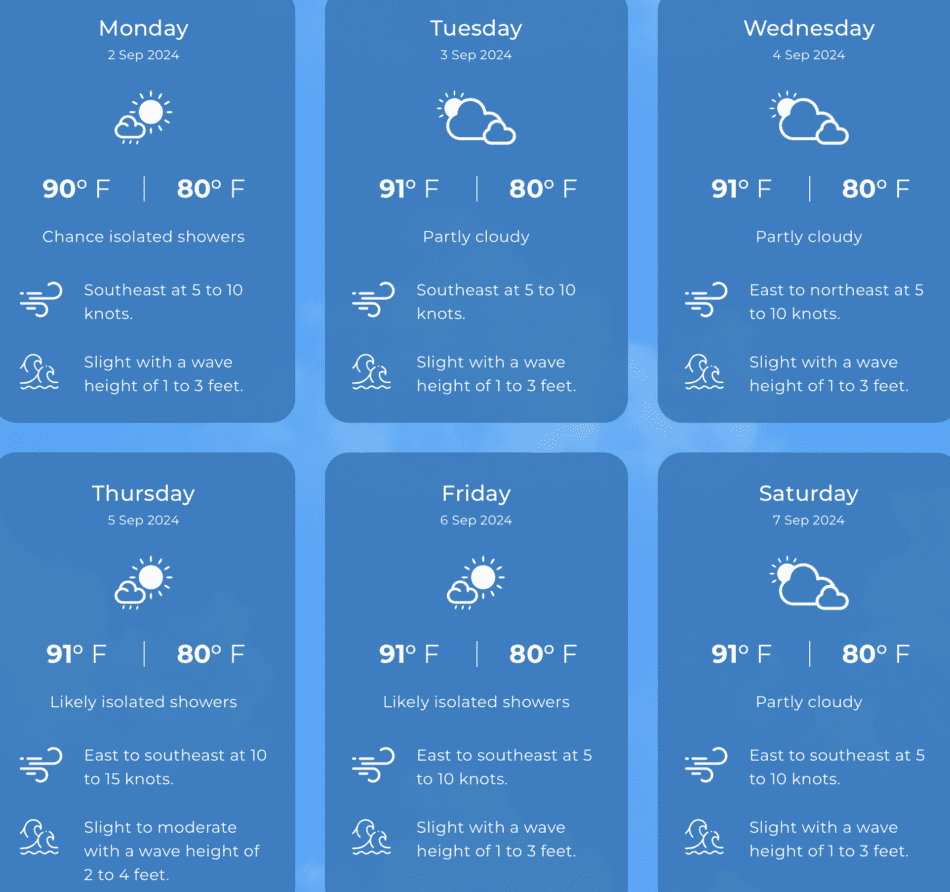 Protection required – UV damages the skin and can cause sunburn. Reduce time in the sun between 11 a.m. and 3 p.m. and take full precaution by seeking shade, covering up exposed skin, wearing a hat and sunglasses, and applying sunscreen.Expected temperatures: 81°F to 90°F. Yesterday: H 91.0°F  L 81.4°F
