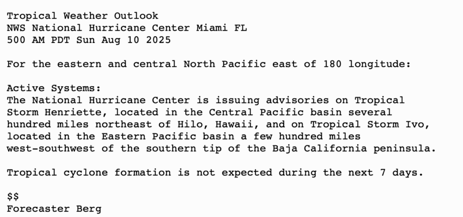 | Tropical Weather Outlook 500 AM PDT Sun 10 Aug 2025 1005 UTC Sun 10 Aug 2025 | |