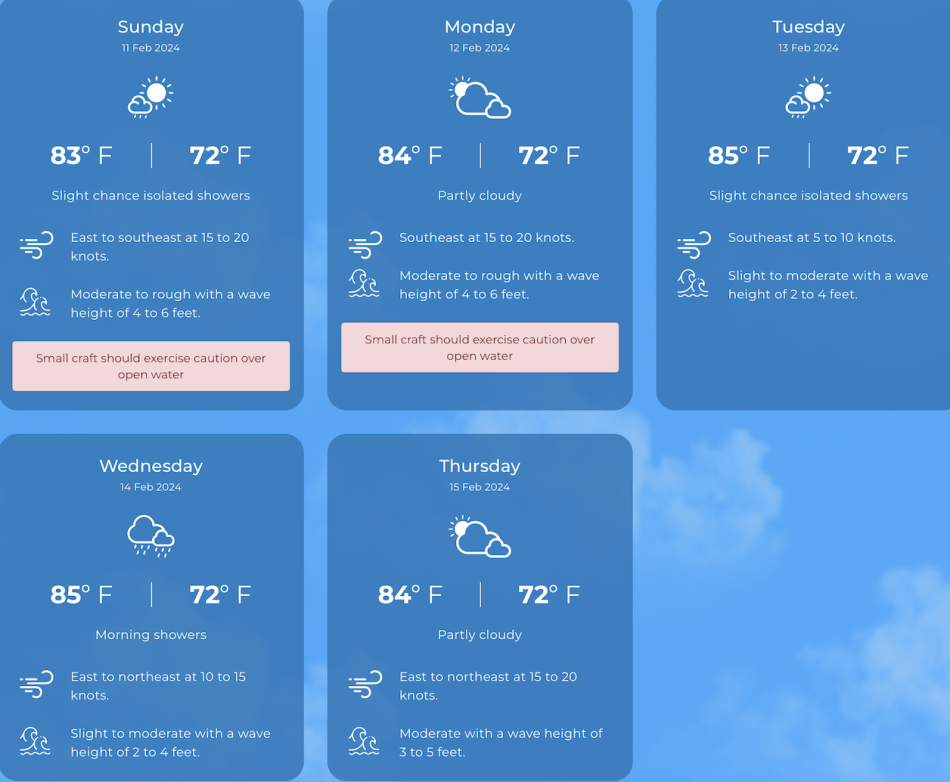 Sea: Moderate to rough with a wave height of 4 to 6 feet. Small craft should exercise caution over open water.