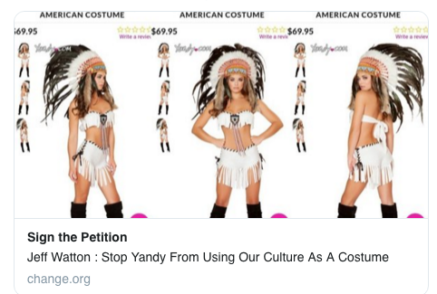 I created my first petition against @Yandy’s racist Native costumes. Please take a minute to sign and RT! #NativeTwitter #CultureNotCostume #NotYourMascothttps://www.change.org/p/jeff-watton-stop-yandy-from-using-our-culture-as-a-costume?recruiter=89423481&utm_source=share_petition&utm_medium=copylink&utm_campaign=share_petition&utm_term=51874ddd24384594823037dbb2942f16 …