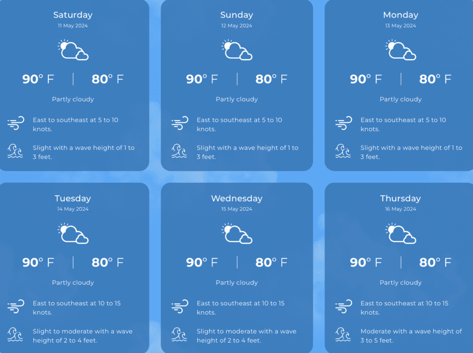 Expected temperatures: 80°F to 90°F. Yesterday: H 90.6°F L 80.4.°F