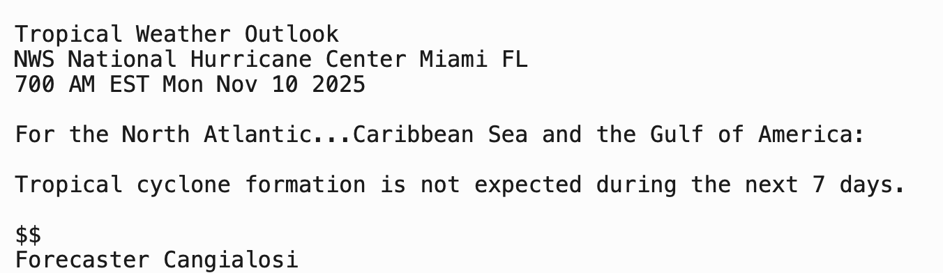 | Tropical Weather Outlook 800 AM EDT Mon 10 Nov 2025 1205 UTC Mon 10 Nov 2025 | |