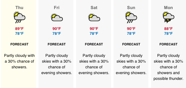 Temperature: Today’s expected temperatures – 80°F to 92°F. Yesterday: H 92.00F L 79.8°F