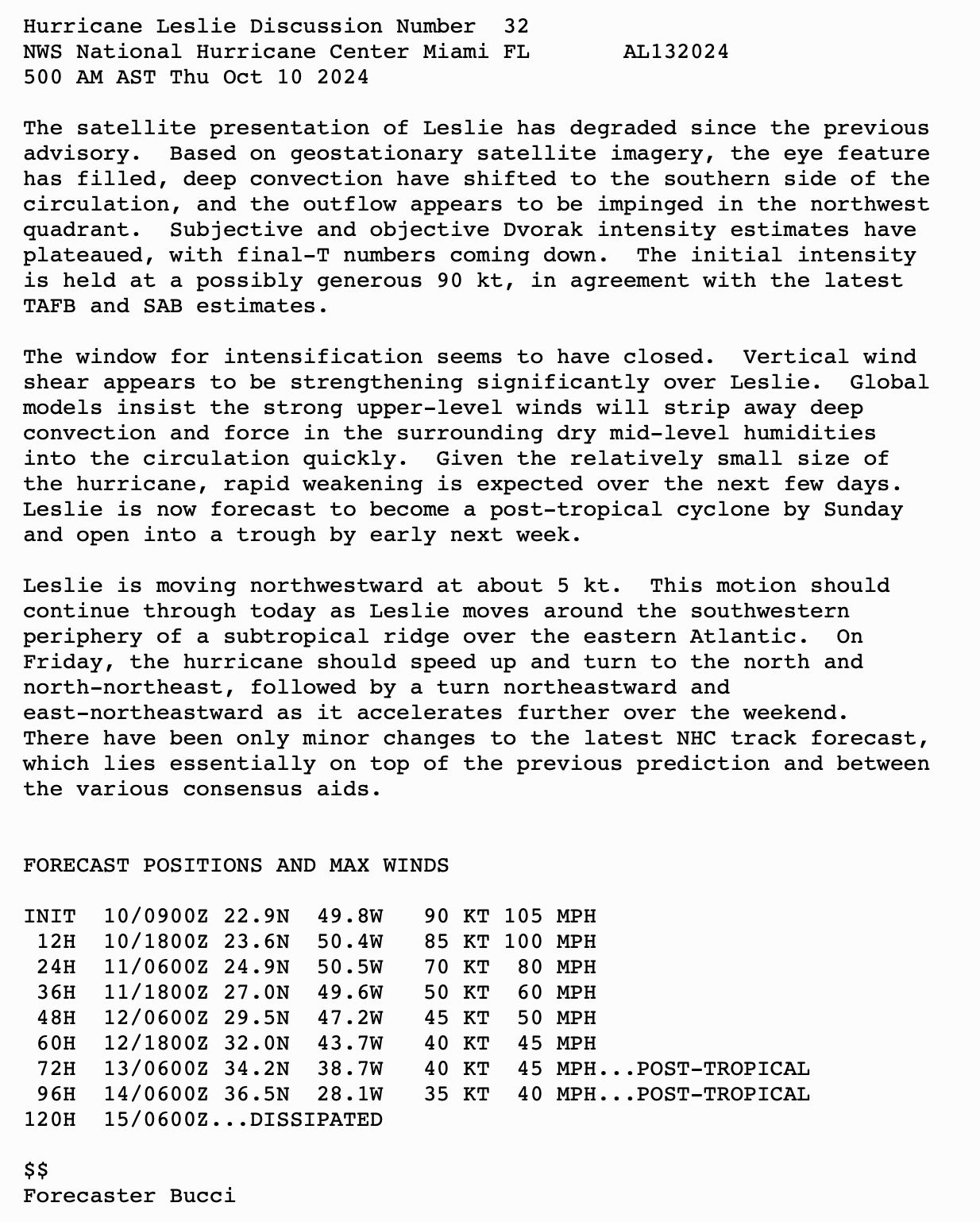 LESLIE LIKELY PEAKED IN STRENGTH