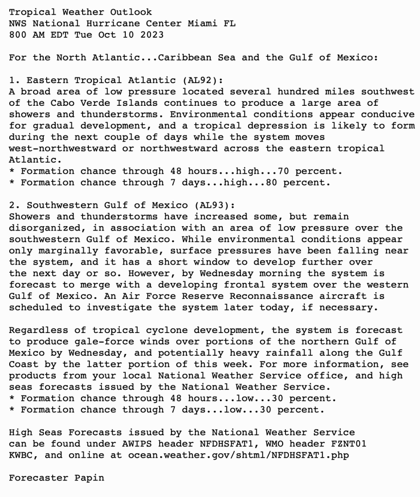 | Tropical Weather Outlook (en Español*) 800 AM EDT Tue 10 Oct 2023 | |