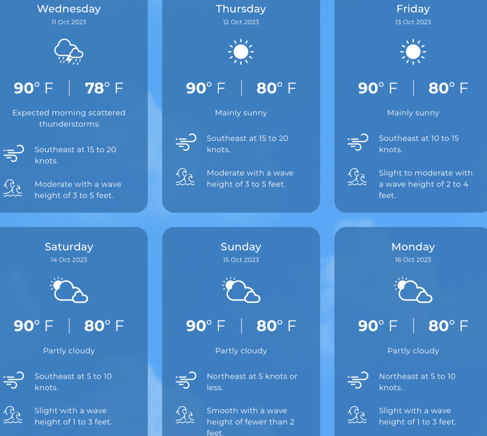 Temperatures: Yesterday – Low 78.8°F, High 91.2°F Today (Expected) – Low 78°F High 90°F