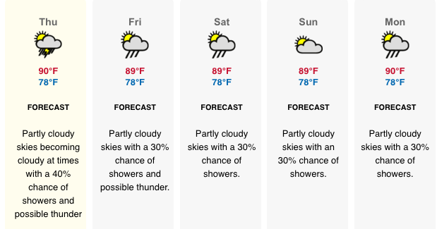 Temperature: Today’s expected temperatures – 80° to 93°F. Yesterday: H 93.7°F L 82.5°F